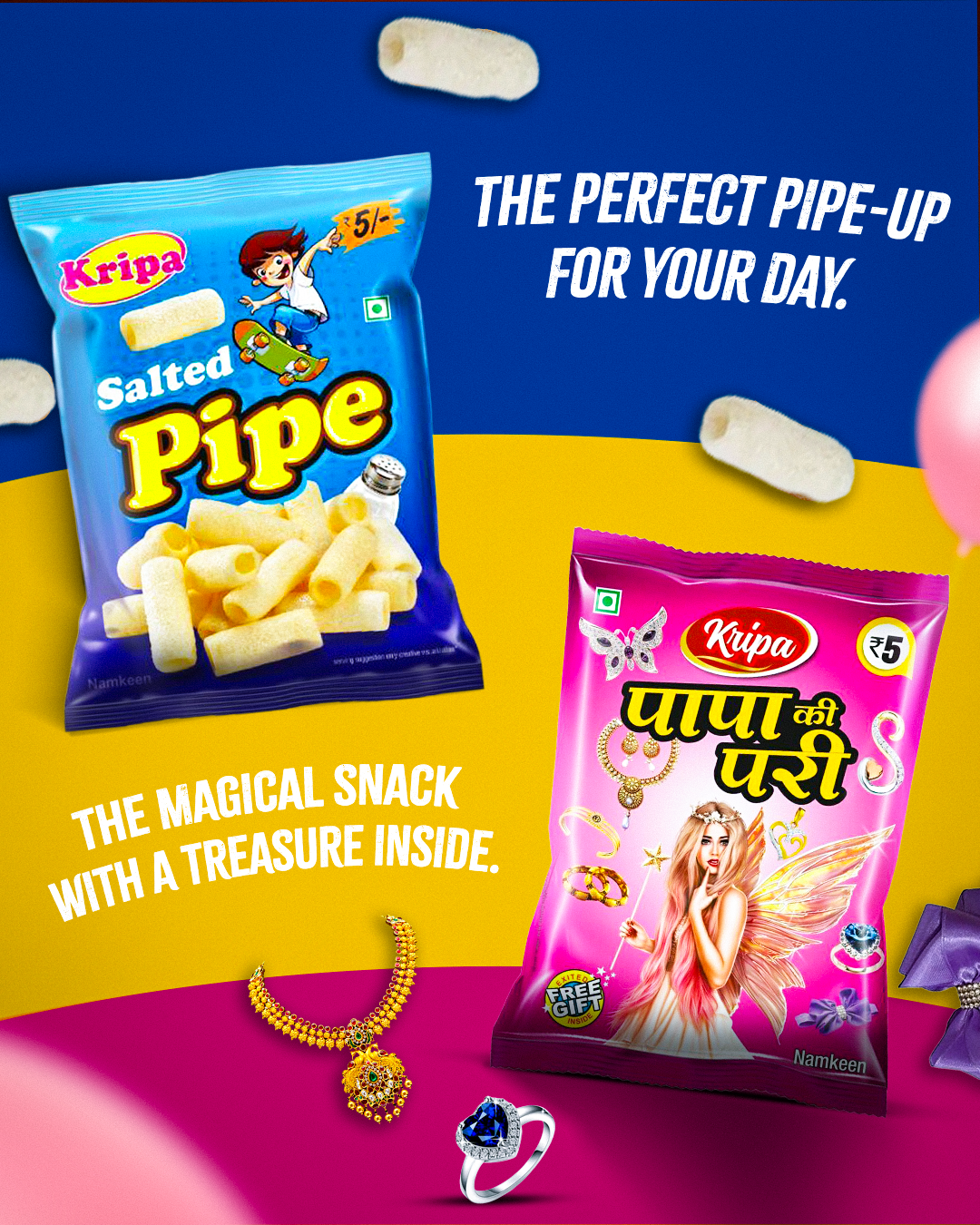Experience the joy of real Indian snacking with Kripa’s kurkure snacks and namkeen.